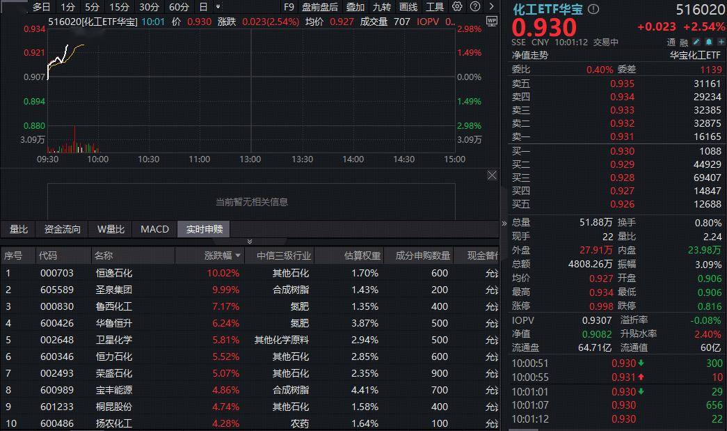 成份股方面,石化、氮肥、合成树脂等板块部分个股涨幅居前。截至发稿,恒逸石化、圣泉集团涨停,鲁西化工飙涨超7%,华鲁恒升、卫星化学、恒力石化等亦涨幅居前。