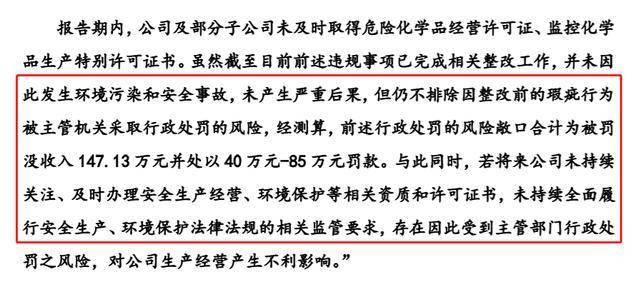 问询回复显示,报告期内,公司及部分子公司未及时取得危险化学品经营许可证、监控化学品生产特别许可证书。虽然截至目前前述违规事项已完成相关整改工作,并未因此发生环境污染和安全事故,未产生严重后果,但仍不排除因整改前的瑕疵行为被主管机关采取行政处罚的风险,经测算,前述行政处罚的风险敞口合计为被罚没收入147.13万元并处以40万元-85万元罚款。