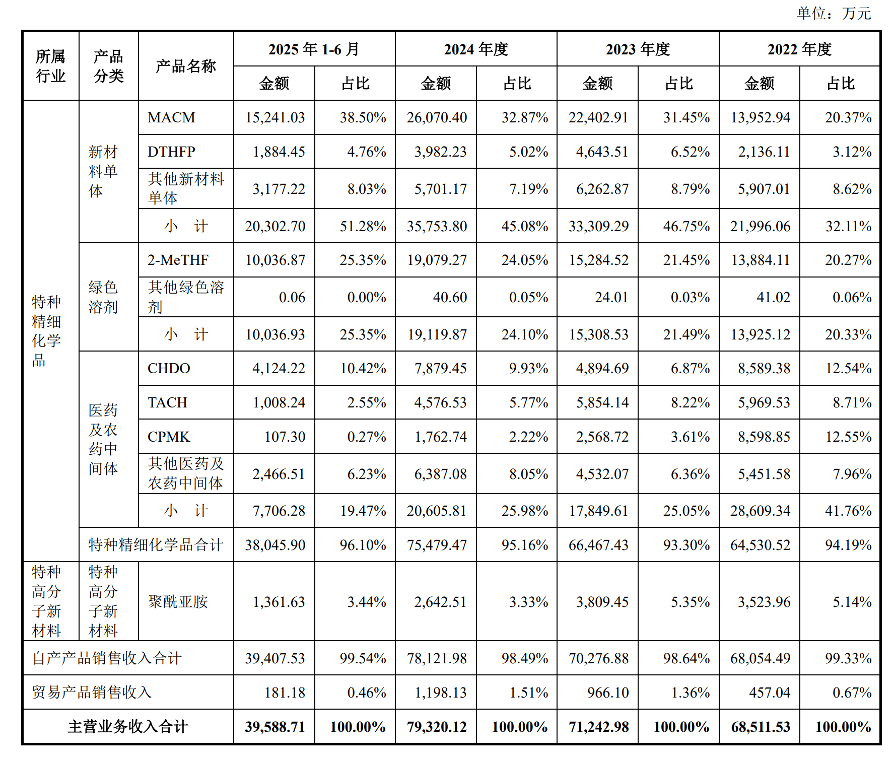 作为招股书重点强调的 “双碳” 战略践行者,清泉股份的非粮生物基产品业务发展呈现与战略表述不符的趋势。报告期内,公司非粮生物基系列产品占主营业务收入的比例从2022年的44.77%下滑至2025年上半年的37.13%,三年间下滑超7个百分点。与之形成鲜明对比的是,以新材料单体MACM为代表的石油基产品收入占比持续上升,石油基产品MACM的收入占比则从20.37%飙升至38.50%。