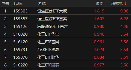 上证报中国证券网讯 4月7日,ETF收盘涨跌不一,恒生医疗ETF(159303)领涨9.98%,恒生医疗ETF(159557)涨6.28%,港股通50ETF(159126)涨4.48%,港股通100ETF(513900)领跌2.92%,港股通ETF(513990)跌1.9%,工程机械ETF(515970)跌1.79%。