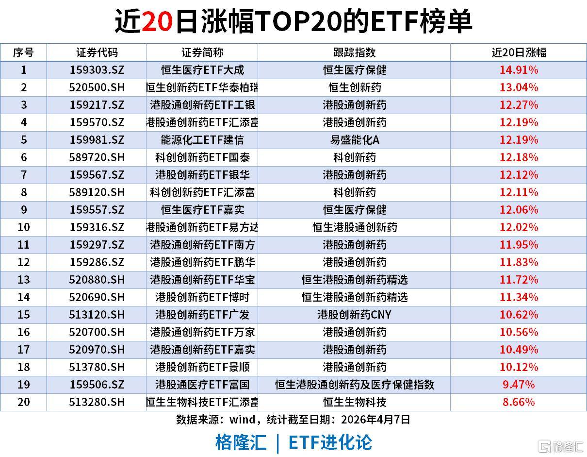 医疗创新药板块:恒生医疗ETF大成以14.91%涨幅登顶,港股通创新药、科创新药等相关ETF包揽榜单前19席,涨幅集中在9.47%-13.04%区间,医药成长成为中期最强风口,行情延续性极强。