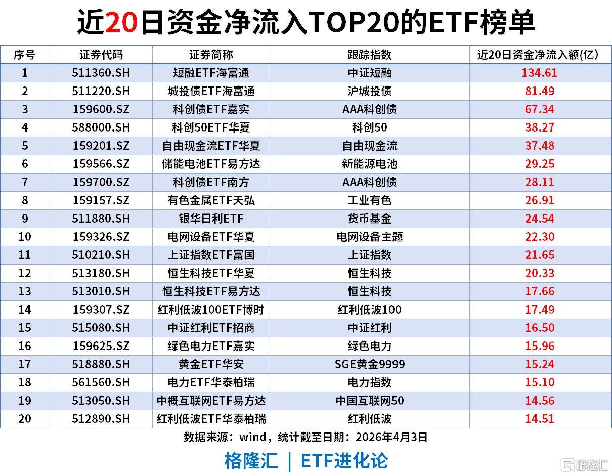 固收与货币:短融ETF海富通以134.61亿净流入登顶,城投债、科创债、银华日利等货币、短融类资产合计流入超300亿,提供稳定配置基础。