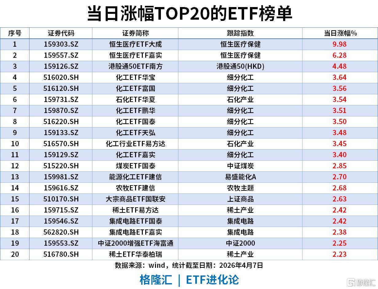 医疗与化工板块成为当日领涨主线,恒生医疗ETF大成以9.98%的涨幅大幅领跑,同赛道恒生医疗ETF嘉实紧随其后,医疗板块呈现极强的脉冲式行情;细分化工、石化产业等化工全产业链ETF批量录得3.4%-3.6%涨幅,成为第二大活跃赛道,煤炭、稀土、集成电路等周期与科技板块仅小幅跟涨,市场情绪聚焦医疗与周期两大方向。