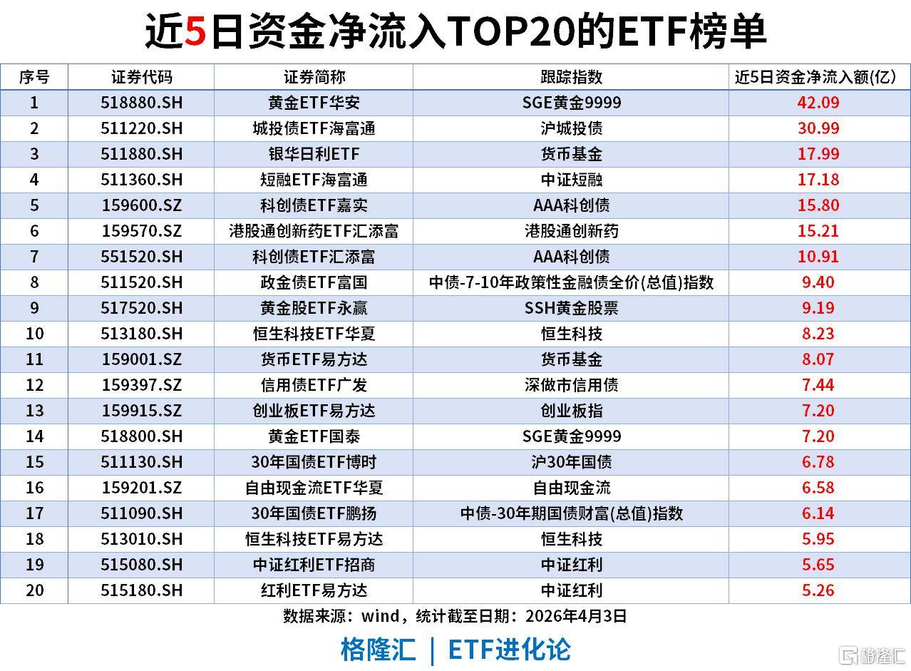黄金资产:黄金ETF华安以42.09亿净流入遥遥领先,黄金股ETF、黄金ETF国泰等黄金相关品种合计流入超58亿,成为中期资金加仓的核心方向,地缘避险逻辑持续强化。
