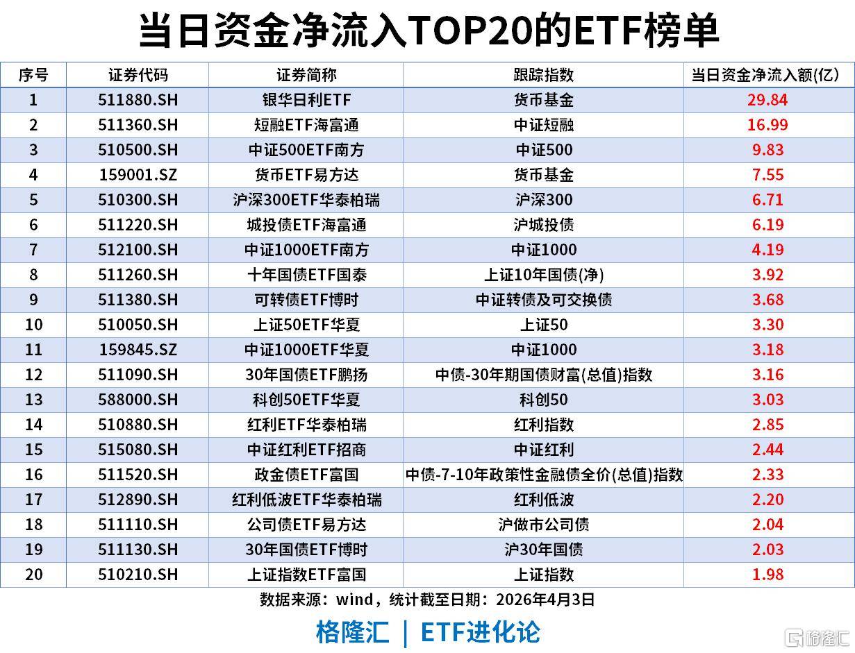 宽基与红利:中证500、沪深300、中证1000等核心宽基获4-9亿资金流入,红利、红利低波等稳健资产同步获配置,资金在避险之余,兼顾宽基底仓布局。