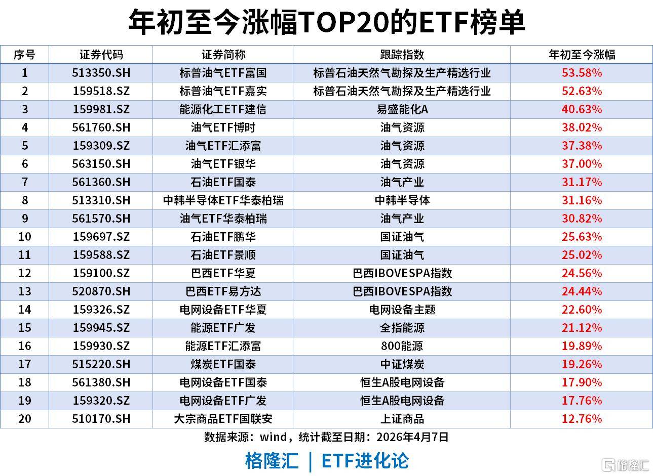 油气资源、能源化工、电网设备、石油、煤炭等能源全产业链ETF批量收获12%-40%涨幅,巴西ETF、大宗商品ETF等全球资源品也进入榜单,能源资源行情贯穿全年,医疗与创新药仅为阶段性行情,未进入年度领涨梯队。