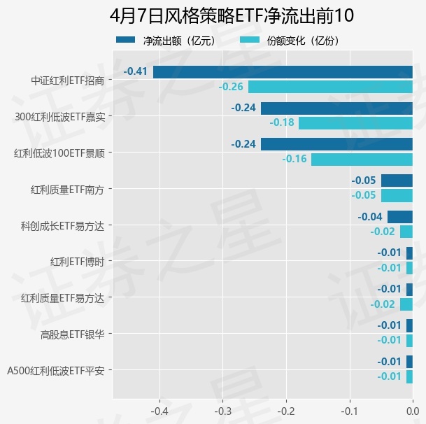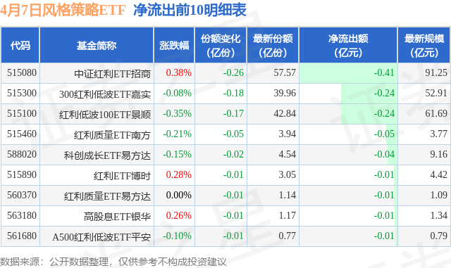 当日有9只风格策略ETF基金出现资金净流出,其中净流出排首位的是中证红利ETF招商(515080),份额减少了2600.0万份,净流出额为4108.27万元。