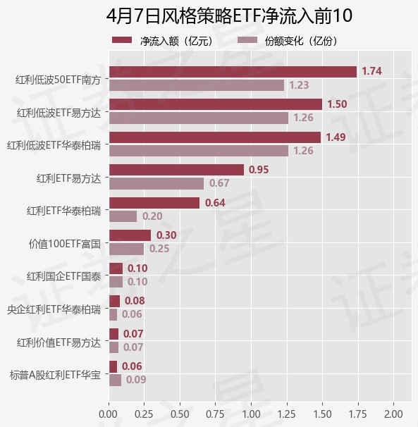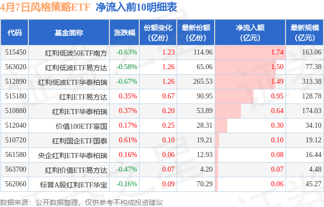 当日有14只风格策略ETF基金出现资金净流入,其中净流入排首位的是红利低波50ETF南方(515450),份额增加了1.23亿份,净流入额为1.74亿元。
