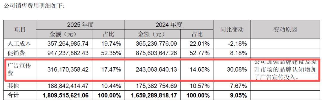 面对伊利金典、蒙牛每日鲜语和君乐宝悦鲜活在线下商超频繁的促销攻势,新乳业不得不大幅增加营销投入以维持市场份额。2025年,新乳业销售费用同比增长9.05%至18.1亿元,增速高于营收增速。其中,广告宣传费达3.16亿元,增速超过30%。