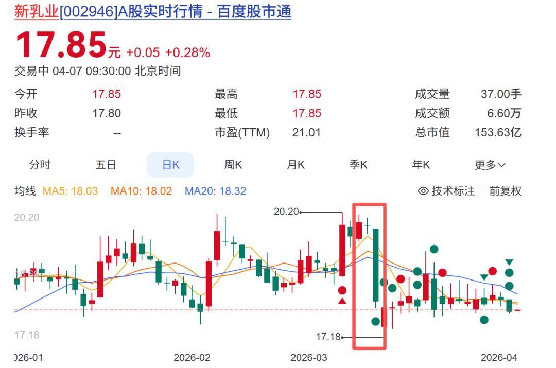 早在2026年3月11日新乳业披露H股上市计划次日,其A股股价便应声暴跌9.21%,创下近一年最大跌幅,两个交易日内市值蒸发超17亿元。