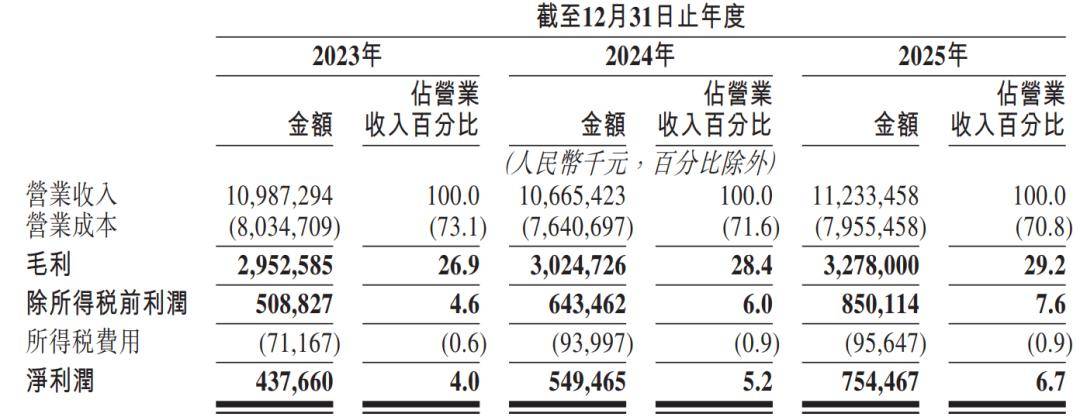 与营收的滞涨形成鲜明对比的是,同期净利润从4.38亿元增长至7.54亿元,复合年增长率高达31.3%,净利润率也从4%提升至6.7%。这份“营利背离”的成绩单,初看亮眼,细究之下却暗藏玄机。
