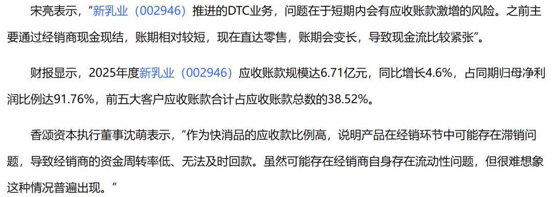 据《北京商报》报道,高级乳业分析师宋亮指出,这与其大力推进的DTC(直接面向消费者)业务模式有关。从传统的经销商现金现结转向直达零售,导致账期拉长,现金流变得紧张。香颂资本执行董事沈萌更是直言,作为快消品,如此高的应收款比例,可能意味着产品在经销环节存在滞销,导致经销商资金周转困难、无法及时回款。