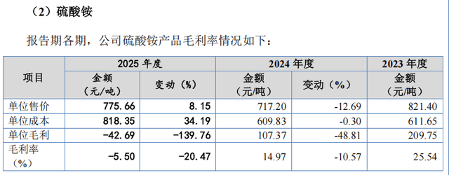 然而,公司硫酸铵产品毛利率2024年出现大幅下滑,2025年甚至为负数,陷入“卖得越多亏得越多”的尴尬境地。招股书显示,2023年至2025年,公司硫酸铵产品毛利率分别为25.54%、14.97%、-5.50%。