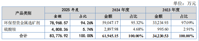 从目前的业务分部来看,森合高科的主营产品只有两种,分别是环保型贵金属选矿剂、硫酸铵。其中,环保型贵金属选矿剂的营收占比常年超过90%,硫酸铵的营收占比在2024年、2025年才慢慢增加至4.68%、5.74%。可以看出,环保型贵金属选矿剂是森合高科的主要业绩支撑,也是公司的核心收入来源。