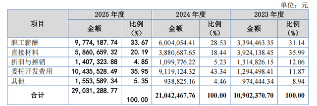 招股书显示,2023年至2025年公司研发费用分别为0.11亿元、0.21亿元、0.29亿元,占营业收入比重分别为3.15%、3.38%、3.46%。从研发费用构成情况来看,包括职工薪酬、直接材料、折旧与摊销、委托开发费用以及其他,而从各项构成的占比来看,委托开发费用金额逐年增加,2024年、2025年分别以43.34%、35.95%的占比成为森合高科研发类成本中的绝对大头。