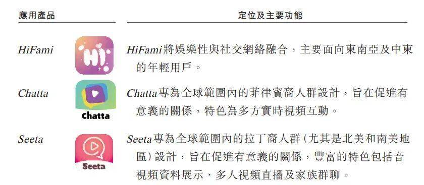 凭借着国内产品的成功发展经验及对在线情感社交行业的商业模式经验,米连科技开始运营以HiFami、Chatta、Seeta 为代表的海外应用产品矩阵,主要面向东南亚、中东、北美及南美等地区的。此外,米连科技还针对特定群体,比如全球范围内的菲律宾裔及拉丁裔人群来精细化垂直运营。