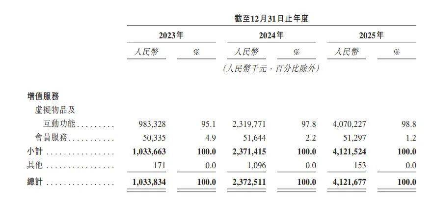 从营收构成来看,打赏带来的虚拟物品及互动模式构成了米连科技最主要的收入来源。2023年至2025年,该部分营收逐年增加,占比分别为95.1%、97.8%到98.8%。而会员订阅收入则逐年递减,到2025年占比只有1.2%。