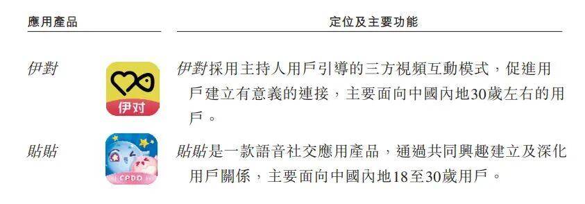 其中,伊对作为米连科技的核心产品,主要面向中国内地30岁左右的用户。通过音视频社交互动,帮助用户建立有意义的连接并获得爱与归属感。伊对也是在线上情感社交行业中首个引入主持人用户引导的三方视频互动模式,可以更好地促进破冰与用户互动。