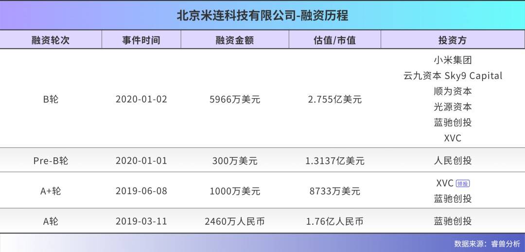 2020年,公司的融资步伐明显加快,先是在1月1日完成了300万美元的Pre-B轮融资,此轮引入了具有国资背景的人民网文化产业投资基金,投后估值跃升至1.31亿美元,随后小米集团和云九资本联合领投,顺为资本、光源资本等一线机构共同参与了米连科技的B轮融资,投后估值达到2.755亿美元。