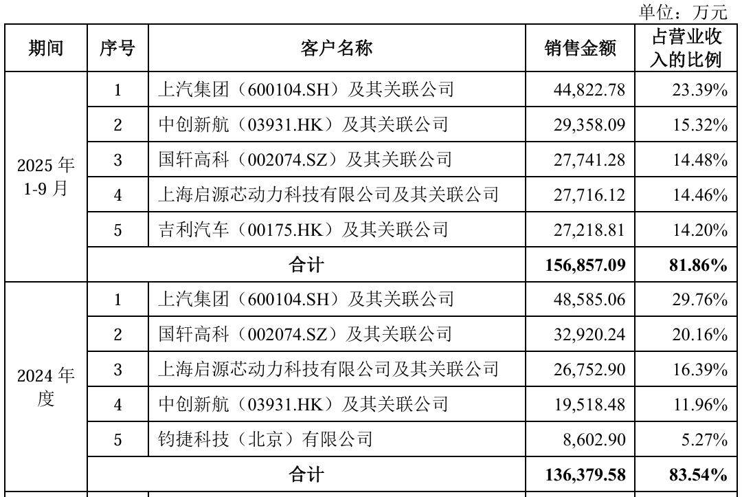 另一方面,客户集中度过高也加剧了这种价格传导的压力。2022年、2023年、2024年度和2025年前三季度(即“报告期”),力高新能来自前五大客户的收入占比分别为64.17%、83.05%、83.54%和81.86%,2023年以来便保持在80%以上。