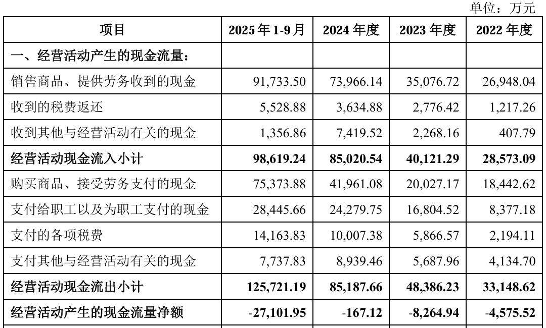 但在营收、利润双增的光鲜表象下,力高新能的财务健康度却面临不小挑战,2022年至2024年经营活动产生的现金流量净额持续告负,分别为-4575.52万元、-8264.94万元和-167.12万元,2025年前三季度这一缺口更扩大至-2.71亿元。