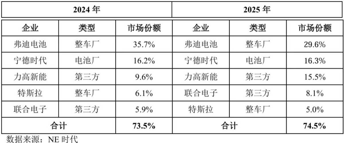 NE时代统计数据显示,2022年至2025年力高新能的国内新能源乘用车BMS市占率分别为7.9%、7.1%、9.6%和15.5%;2025年市场排名第三,仅次于弗迪电池与宁德时代,并在第三方BMS厂商中位列第一。