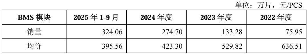 需要指出的是,力高新能的BMS模块产品相当畅销,销量由2022年的75.95万片翻倍增至2025年前三季度的324.06万片。但产品均价却不增反降,2022年尚且能达到636.51元/PCS,到了2025年前三季度仅剩395.56元/PCS。
