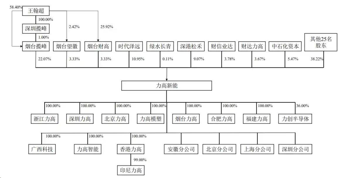 本次上市前,烟台揽峰直接持有力高新能22.07%的股份,为后者的控股股东。其中,王翰超为烟台揽峰执行事务合伙人深圳揽峰100%股东,为烟台望徽、烟台财高的执行事务合伙人。据此,王翰超通过前述主体间接控制力高新能28.73%股权的表决权,为该公司的实际控制人。