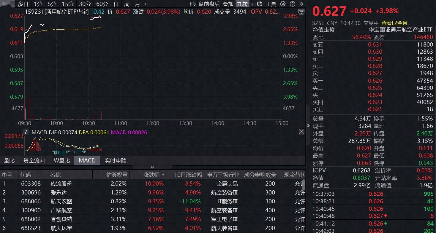 4月8日早盘,航空航天王者归来,应流股份涨停封板,爱乐达、航天宏图、广联航空三股暴涨逾9%,商业航天+卫星导航+低空经济+大飞机的通用航空ETF华宝(159231)场内快速冲高3.98%,有望止步五连阴,盘中收复5日、10日均线。