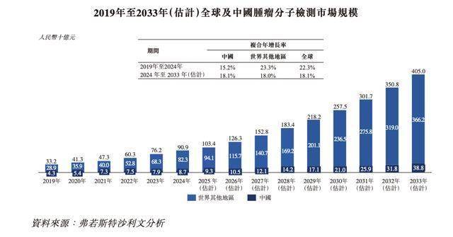 全球肿瘤分子检测市场规模由2019年的332亿元增长至2024年的909亿元,复合年增长率为22.3%,在基于PCR的甲基化检测与血液液态活检技术的驱动下,预计2033年将达到4,050亿元,复合年增长率为18.1%。中国市场规模由2019年的43亿元增长至2024年的87亿元,复合年增长率为15.2%,预计2033年将达到388亿元,2024至2033年间复合年增长率为18.1%。
