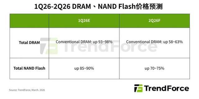 TrendForce集邦咨询最新发布的存储器价格调查报告显示,2026年第二季因DRAM原厂积极将产能转向HBM、Server应用,并采用“补涨”策略拉近各类产品价差,尽管终端市场面临出货下修风险,预估整体一般型DRAM(Conventional DRAM)合约价格仍将季增58%-63%。NAND Flash市场持续由AI、数据中心需求主导,全产品线连锁涨价的效应不减,预计第二季整体合约价格将季增70%-75%。