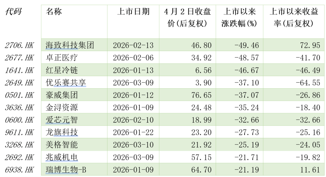 相较而言,消费与医药行业公司上市数量占比有所下降,虽有大型消费龙头牧原股份(2714.HK)、东鹏饮料(9980.HK)以及生物科技公司精锋医疗-B(2675.HK)、瑞博生物-B(6938.HK)等登场,但这类赛道或缺乏独特叙事或处于传统行业,市场热度不高。截至4月2日收盘,传统行业中的优乐赛共享(2649.HK)破发幅度达37.1%、卓正医疗(2677.HK)破发48.57%、红星冷链(1641.HK)破发46.67%,而同仁堂医养选择了暂缓上市。