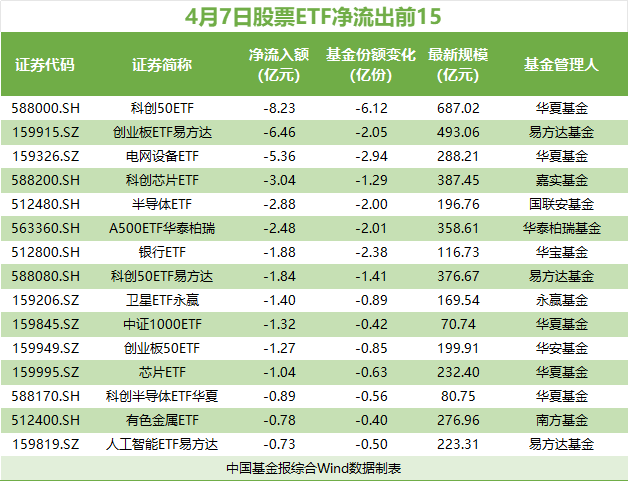 4月7日,行业主题ETF资金净流出居前,达20.48亿元。其中,半导体板块净流出10.6亿元,电网设备板块净流出5.8亿元。