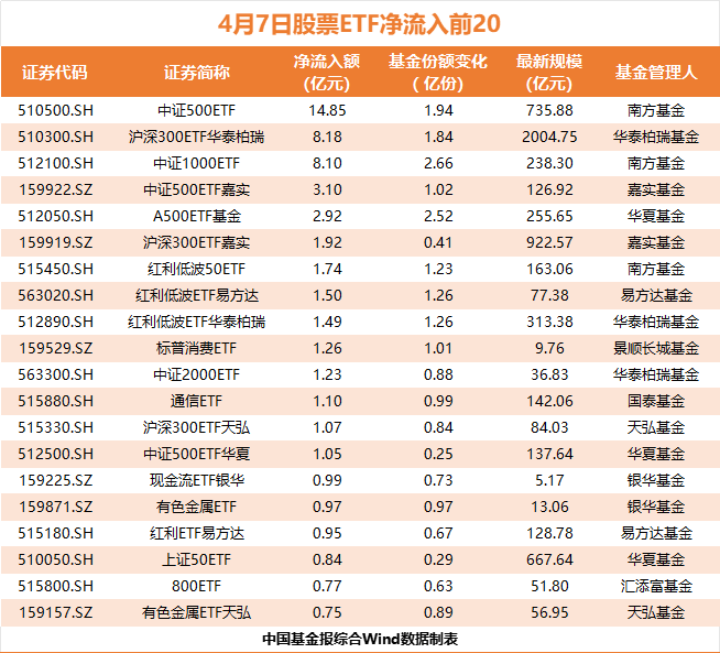 清明节假期后首个交易日(4月7日),A股市场宽幅震荡,三大指数最终集体收涨。股票ETF市场上,资金延续了节前的抄底趋势,净流入超12亿元。