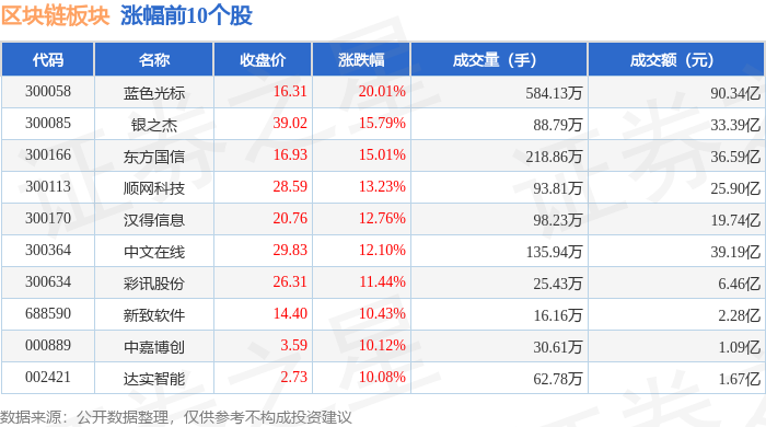 证券之星消息,4月8日区块链板块较上一交易日上涨5.06%,蓝色光标领涨。当日上证指数报收于3995.0,上涨2.69%。深证成指报收于14042.5,上涨4.79%。区块链板块个股涨跌见下表: