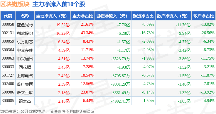 从资金流向上来看,当日区块链板块主力资金净流入87.44亿元,游资资金净流出40.29亿元,散户资金净流出47.15亿元。区块链板块个股资金流向见下表: