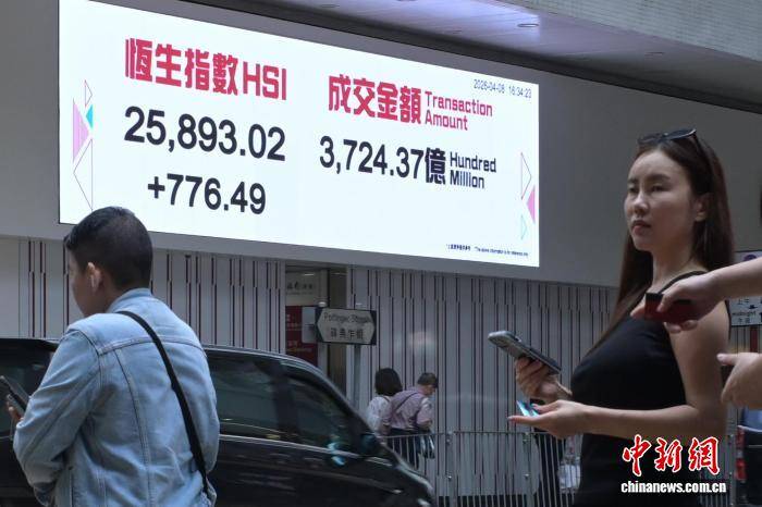 4月8日,香港恒生指数涨776.49点,涨幅3.09%,收报25893.02点。全日主板成交3724.37亿港元。 中新社记者 陈永诺 摄