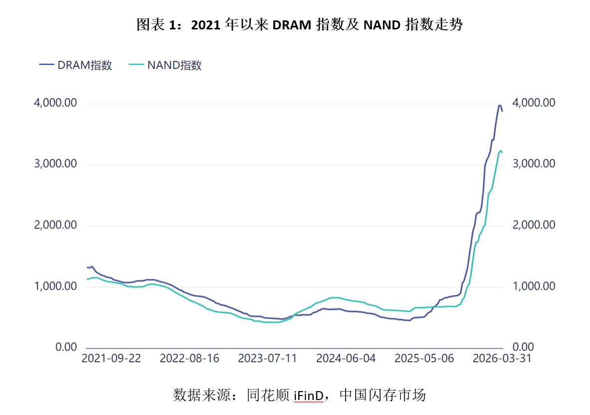 根据同花顺iFinD数据,2025年7月初,反映存储芯片价格走势的DRAM指数、NAND指数分别为731.64、677.73;到2025年末,两大指数分别上涨至2309.29、1896.1,涨幅分别达215.6%、179.8%;2026年3月末,两大指数进一步攀升至3867.57、3194.62,其中DRAM指数较2025年7月初涨幅超400%,NAND指数涨幅超371%。