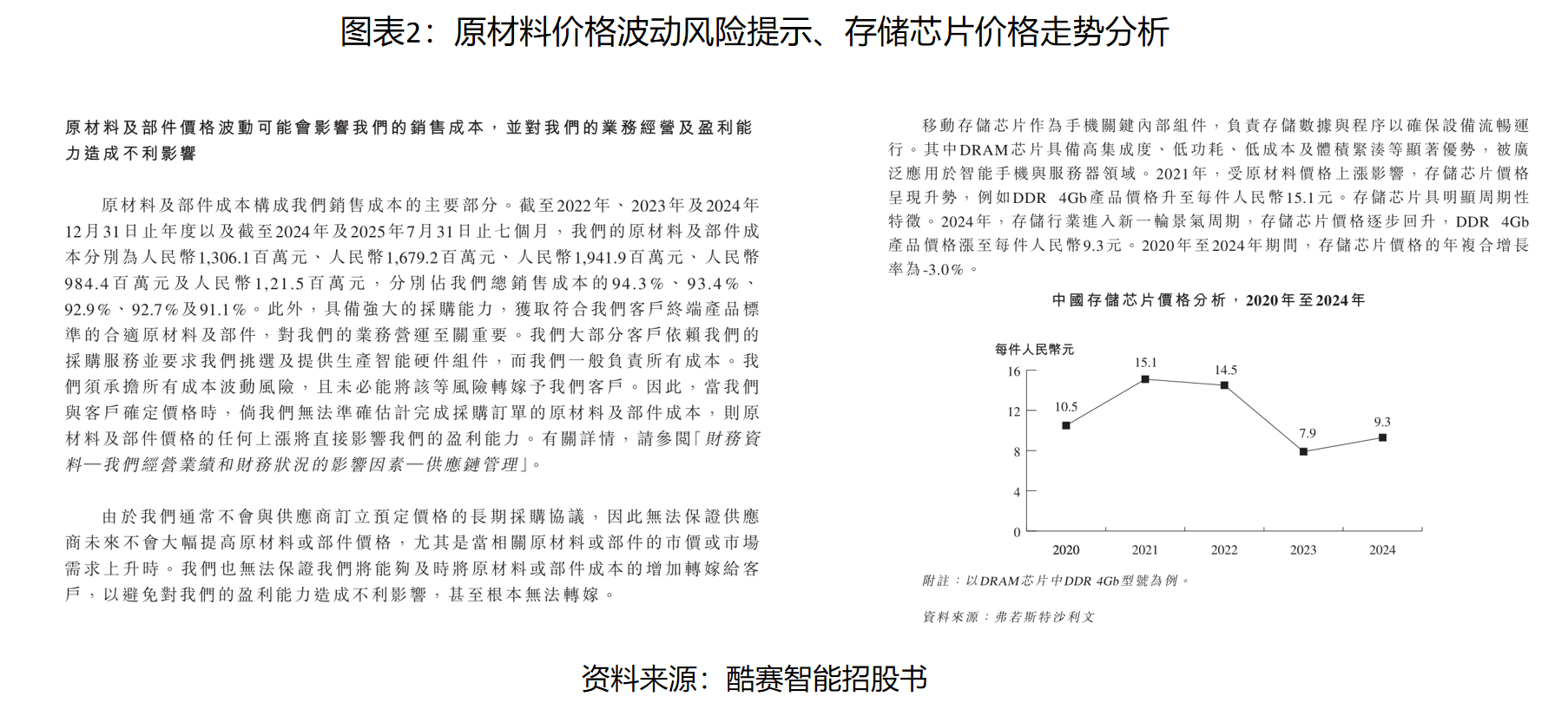 酷赛智能向时代商业研究院表示,招股书的“风险因素” 章节已全面、如实披露了公司经营过程中面临的各类重大风险,包括但不限于原材料价格波动风险、供应链风险、市场竞争风险等。相关披露符合港交所关于 “披露所有重大及具体风险” 的监管要求。存储芯片价格受全球产业链供需影响处于动态变化中,后续公司将持续关注市场走势,并严格按照香港上市监管要求,及时、完整地更新相关风险披露内容。