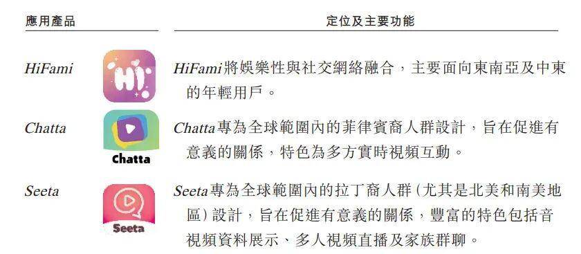 凭借着国内产品的成功发展经验及对在线情感社交行业的商业模式经验,米连科技开始运营以 HiFami、Chatta、Seeta 为代表的海外应用产品矩阵,主要面向东南亚、中东、北美及南美等地区的。此外,米连科技还针对特定群体,比如全球范围内的菲律宾裔及拉丁裔人群来精细化垂直运营。