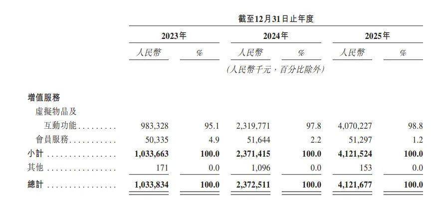 从营收构成来看,打赏带来的虚拟物品及互动模式构成了米连科技最主要的收入来源。2023 年至 2025 年,该部分营收逐年增加,占比分别为 95.1%、97.8% 到 98.8%。而会员订阅收入则逐年递减,到 2025 年占比只有 1.2%。