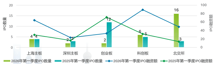 平均融资规模方面,德勤表示,2026年一季度,上交所主板、深交所主板、科创板、创业板平均融资规模分别为16.1亿元、11.6亿元、14.9亿元和16.6亿元,较上年同期7.4亿元、5.5亿元、6.4亿元和6.0亿元的平均融资规模,均有所增长。