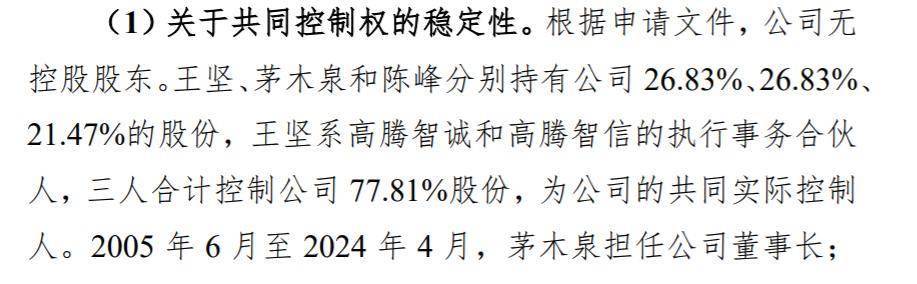 根据申请文件,公司无控股股东。王坚、茅木泉和陈峰分别持有公司26.83%、26.83%、21.47%的股份,王坚系高腾智诚和高腾智信的执行事务合伙人,三人合计控制公司77.81%股份,为公司的共同实际控制人。2005年6月至2024年4月,茅木泉担任公司董事长;2024年4月起王坚担任公司董事长。