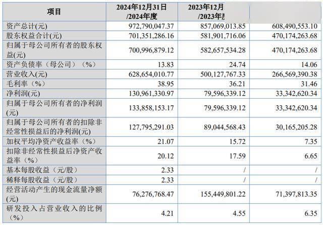业绩方面,2022年至2024年,公司营业收入分别为2.67亿元、5.00亿元和6.29亿元,净利润分别为0.33亿元、0.80亿元与1.31亿元。