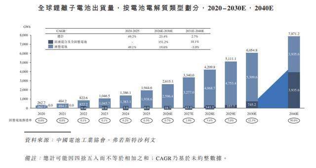 自2022年开始统计固液混合电池及全固态电池出货量以来,到2025年,这些电池的全球出货量已从约0.4GWh提升至6.0GWh,在整体锂离子电池出货量中的渗透率由0.1%提升至0.3%,2022–2025年期间复合年增长率约143.3%,处于导入及示范应用阶段。随后,随著商业化进程推进逐步进入规模化放量阶段,固液混合及全固态电池出货量预计将快速增至2030年的745.2GWh,其市场渗透率预计提升至约12.3%。中长期来看,固液混合及全固态电池出货量预计将提升至2040年的3,935.6GWh,对应渗透率预计将提升至50.0%。