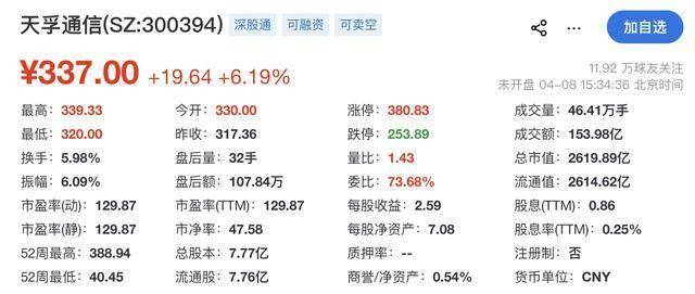 截至发稿时,天孚通信A股报337元,总市值约2619.89亿元。