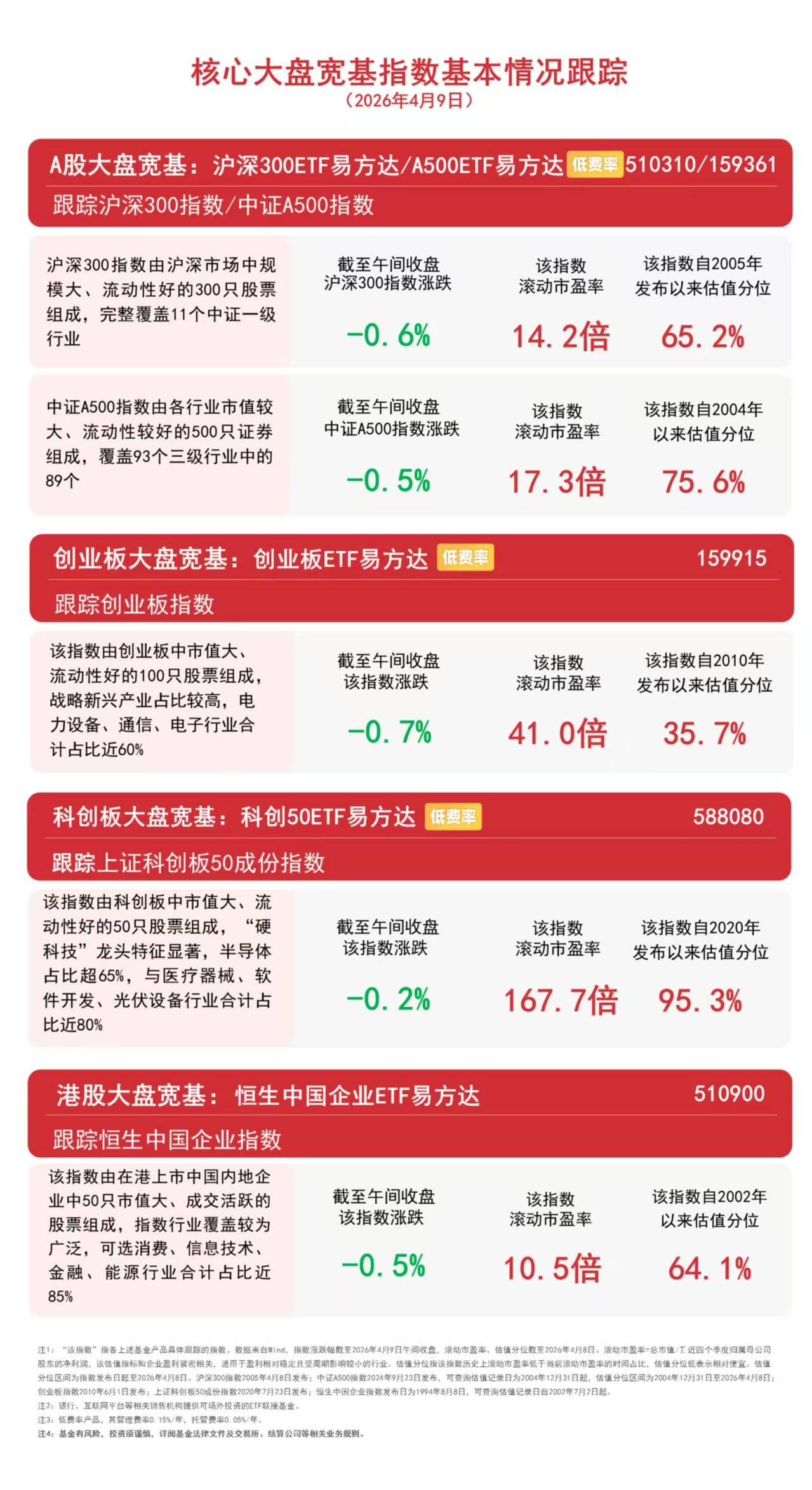 截至午间收盘,中证A500指数下跌0.5%,沪深300指数下跌0.6%,创业板指数下跌0.7%,上证科创板50成份指数下跌0.2%,恒生中国企业指数下跌0.5%。