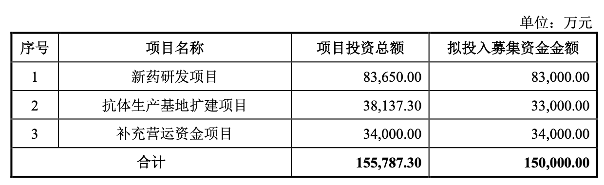 招股书显示,公司本次拟公开发行人民币普通股不超过6908.1928万股。募集资金拟用于新药研发项目、抗体生产基地扩建和补充营运资金。其中,8.3亿元拟投向新药研发。