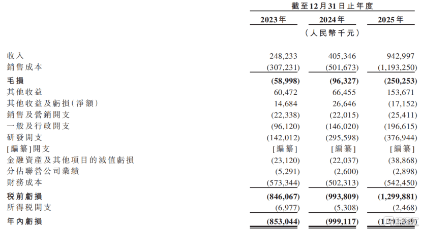 2023年、2024年及2025年(报告期),公司的收入分别为2.48亿元、4.05亿元、9.43亿元,毛损率分别为23.8%、23.8%及26.5%,净利润分别为-8.53亿元、-9.99亿元、-13.02亿元。