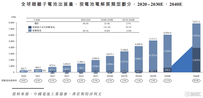 随后,随着商业化进程推进逐步进入规模化放量阶段,固液混合及全固态电池出货量预计将快速增至2030年的745.2GWh,其市场渗透率预计提升至约12.3%。